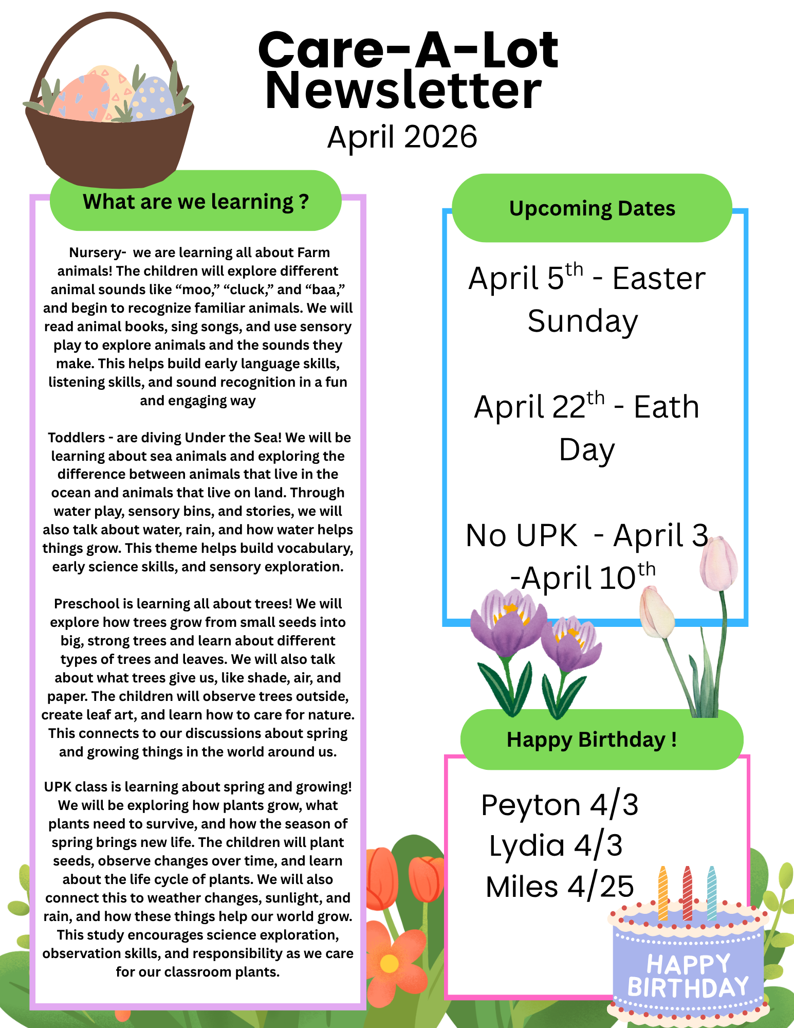 April Showers bring May flowers , and we are so excited for all the signs of Spring ! As the weather awarms up we will be spending a lot of time outside. Pleaser mnmkae sure your child has a rain boots and a rain jacket at the center , as we still go outside after it rains especially when the weather is nice afterwords !